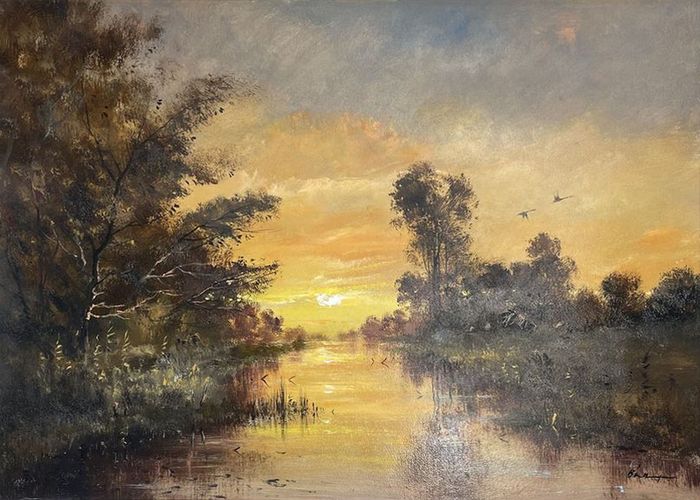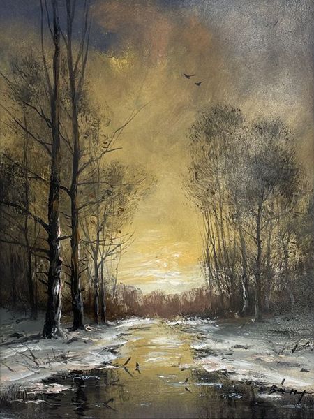Bán Tibor : Alkonyodik. A festmény mérete: 50 x 70 cm, anyaga: farost/olajfestmény Téma: tájkép. A festmény zsűri által meghatározott ára: 190000 forint. Készpénz esetén a festmény ára: 152000 forint. Az ár egy választható kerettel együtt értendő. Kérésre postai utánvéttel, csomagban elküldhetjük a festményt. A festményt a művész 2025-ben festette.