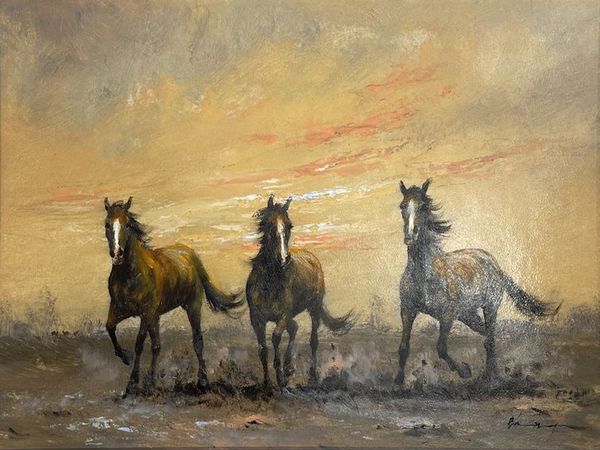 Molnár G. Zoltán : Vágta. Az alkotás zsűri által meghatározott ára: 148000 forint. Készpénz esetén az alkotás ára: 118400 forint. Az alkotás anyaga: olajfestmény/selyem. Téma : lovaskép. Az alkotás mérete: 50 x 60 cm. A festmény megvásárolható 20 havi kamatmentes részletre. Készpénz esetén 20% engedményt adunk. Készpénz esetén postai utánvéttel, csomagban is elküldjük a festményt. A festményt a művész 2015-ben festette.