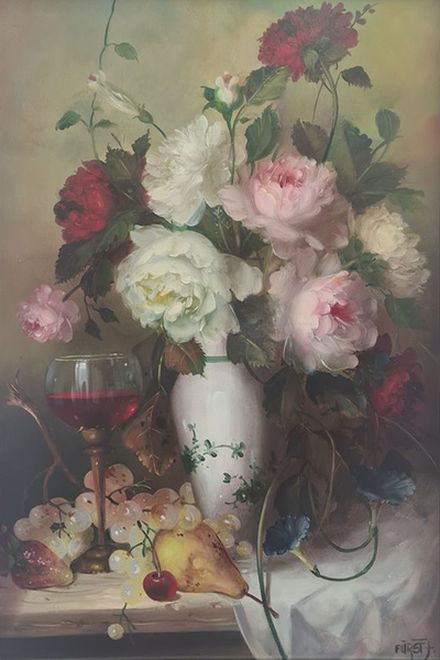 Fürst József : Rózsacsokor. A festmény zsűri által meghatározott ára: 150000 forint. Készpénz esetén a festmény ára: 120000 forint. Téma: csendélet. A festmény anyaga: farost/olajfestmény. Az ár egy választható kerettel együtt értendő. A festmény mérete: 60 x 30 cm. Postai utánvéttel, csomagban is elküldhetjük a festményt. A festményt a művész 2024-ben festette.