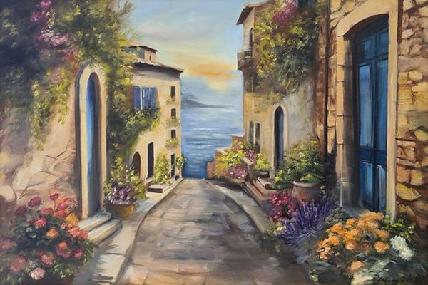 V. Tóth Gábor : Spanyol utca. A festmény zsűri által meghatározott ára: 35000 forint. Készpénz esetén a festmény ára: 28000 forint. Az ár egy választható kerettel együtt értendő. A festmény mérete: 18 x 13 cm. A festmény anyaga: farost/olajfestmény Téma: mediterrán. Készpénz esetén postai utánvéttel, csomagban is elküldjük a festményt. A festményt a művész 2023-ban festette.