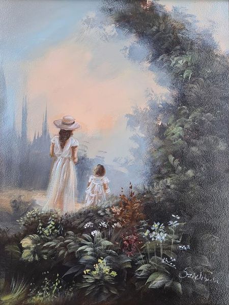 Varga Szidónia: Kerti hangulat. A festmény zsűri által meghatározott ára 75000 forint, készpénz esetén 60000 forint. A festmény mérete 40 x 20 cm, anyaga olajfestmény/farost. Téma: életkép. A festmény megvásárolható 20 havi kamatmentes részletre is. Postai utánvéttel, csomagban is elküldhetjük a festményt. A festményt a művész 2025-ben festette.