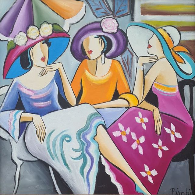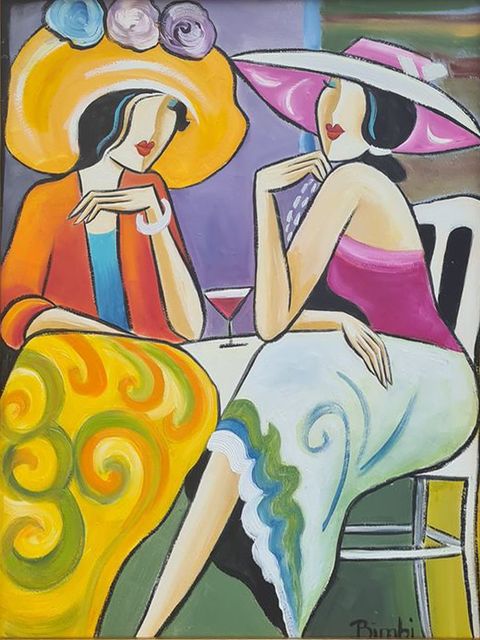Bimbi /Harangozó Ilona/ : Barátnők. Az alkotás zsűri által meghatározott ára 145000 forint, készpénz esetén 116000 forint. Mérete : 40 x 30 cm, anyaga : olajfestmény/farost. Téma: modern. Postai utánvéttel, csomagban is elküldhetjük a festményt. A festményt a művész 2025-ben festette.