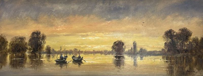 Bán Tibor: A horgásztó alkonyi fényben. A festmény mérete: 30 x 80 cm. A festmény anyaga: farost/olajfestmény Téma: tájkép. A festmény zsűri által meghatározott ára: 180000 forint. Készpénz esetén a festmény ára: 144000 forint. Az ár egy választható kerettel együtt értendő. Kérésre postai utánvéttel, csomagban elküldhetjük a festményt. A festményt a művész 2025-ben festette.