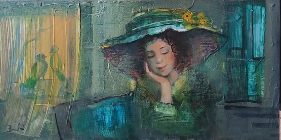 Bimbi /Harangozó Ilona/ : Kalapban I. Az alkotás zsűri által meghatározott ára 75000 forint, készpénz esetén 60000 forint. Mérete : 15 x 15 cm, anyaga : olajfestmény/farost. Téma: modern. Postai utánvéttel, csomagban is elküldhetjük a festményt. A festményt a művész 2025-ben festette.