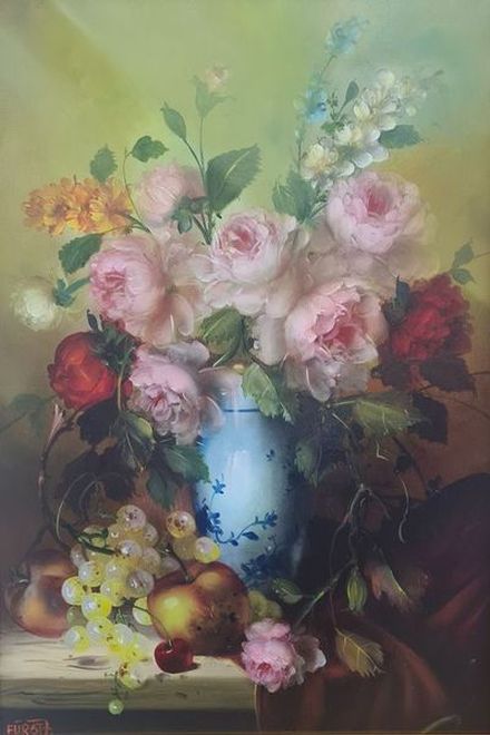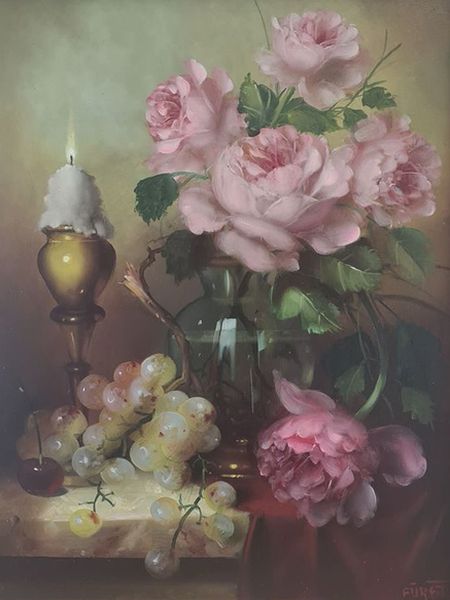 Fürst József : Rózsacsokor. A festmény zsűri által meghatározott ára: 150000 forint. Készpénz esetén a festmény ára: 120000 forint. Téma: csendélet. A festmény anyaga: farost/olajfestmény. Az ár egy választható kerettel együtt értendő. A festmény mérete: 60 x 30 cm. Postai utánvéttel, csomagban is elküldhetjük a festményt. A festményt a művész 2024-ben festette.