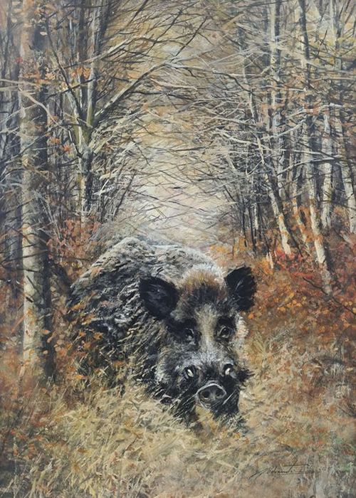 Udvarnoki Péter : Vaddisznó. Az alkotás zsűri által meghatározott ára 180000 forint, készpénz esetén 144000 forint. Az ár egy választható kerettel együtt értendő. A festmény mérete 40 x 30 cm, anyaga olajfestmény/farost. Téma: vadászfestmény. Megvásárolható 20 havi kamatmentes részletre is. Postai utánvéttel, csomagban is elküldhetjük a festményt.