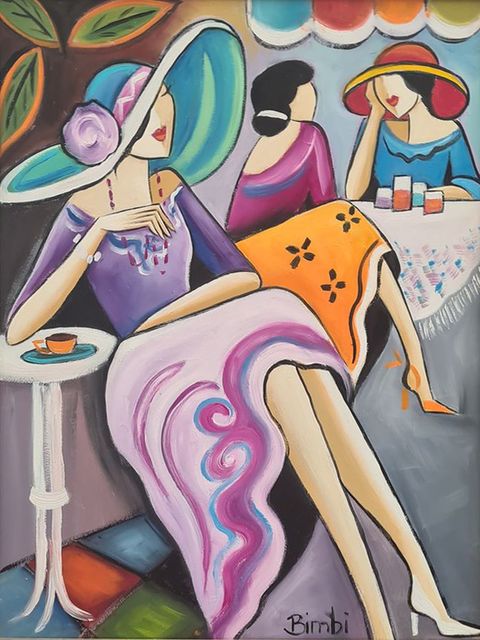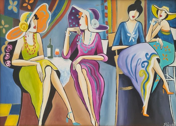 Bimbi /Harangozó Ilona/ : Barátnők. Az alkotás zsűri által meghatározott ára 145000 forint, készpénz esetén 116000 forint. Mérete : 40 x 30 cm, anyaga : olajfestmény/farost. Téma: modern. Postai utánvéttel, csomagban is elküldhetjük a festményt. A festményt a művész 2025-ben festette.